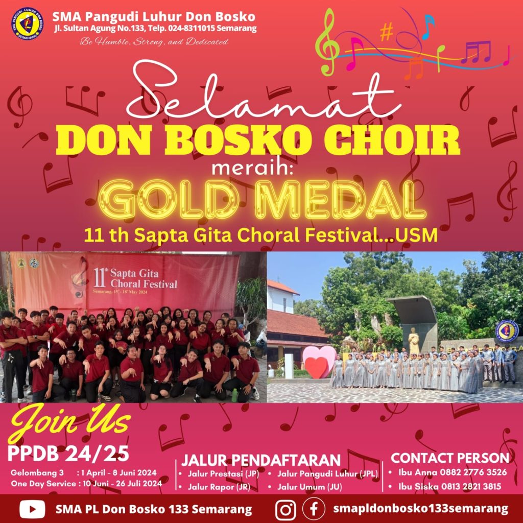 DON BOSKO CHOIR ( DBC ) MERAIH GOLD MEDAL 2024 Don Bosko Choir ( DBC ) merupakan salah satu ekstrakurikuler unggulan di SMA PL Don Bosko karena sering mendapatkan juara dalam kompetisi paduan suara di tingkat kota, provinsi, dan nasional. Dalam ajang 11 th Sapta Gita Choral Festival USM, DBC meraih gold medal dengan […]