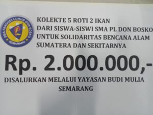 Dana Rp2.000.000,00 yang berhasil terkumpul ditujukan bagi korban banjir bandang di Sumatra Barat, Sumatra Utara, dan Aceh. Penyalurannya melalui Yayasan Budi Mulya Semarang agar bantuan tepat sasaran dan bermanfaat secara nyata. Dana berbagi diserahkan oleh perwakilan murid SMA PL Don Bosko kepada Br. Yohanes Sudaryono, FIC, selaku Ketua Yayasan Budi Mulya Semarang pada hari Kamis, 18 Desember 2025. Kegiatan penuh makna empati ini disaksikan oleh Kepala Sekolah, Wakil Kepala Sekolah Bidang Kesiswaan, dan Koordinator Humas SMA PL Don Bosko.