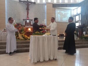 Suasana penuh syukur semakin terasa ketika Br. Agustinus Giwal Santoso, FIC memimpin prosesi pemotongan tumpeng sebagai ungkapan terima kasih atas penyertaan Tuhan Yesus Kristus dan Bunda Maria dalam perjalanan karya Yayasan Pangudi Luhur. Potongan tumpeng pertama diserahkan kepada Br. FA Dwiyatno, FIC, sebagai simbol rasa syukur dan persaudaraan di antara para Bruder, guru dan karyawan Pangudi Luhur.