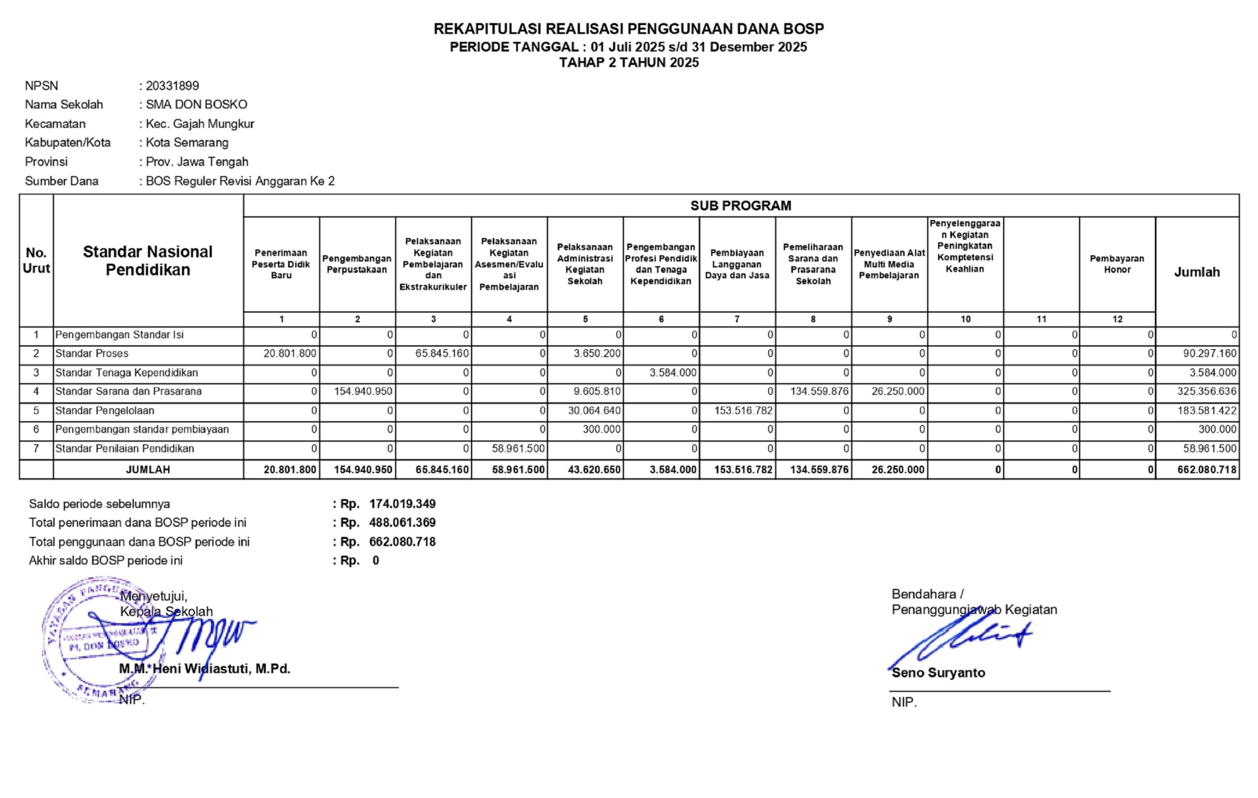 REKAPITULASI REALISASI PENGGUNAAN DANA BOSP TAHAP 2 TAHUN 2025 PERIODE TANGGAL : 01 Juli 2025 s/d 31 Desember 2025